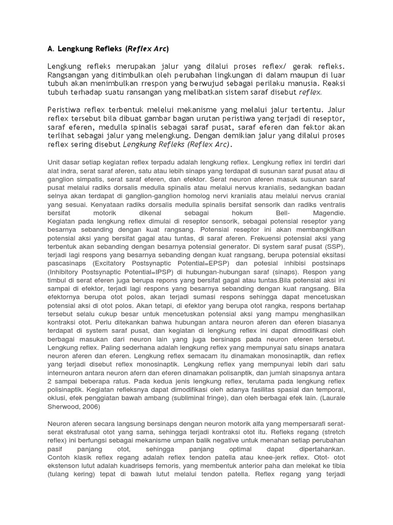 Lengkung refleks yang paling sederhana disebut monosinaptik, yang hanya mempunyai sinaps tunggal antara neuron aferen dan neuron eferen. Kegiatan pada lengkung refleks di mulai di reseptor sensorik sebagai potensial reseptor yang besarnya sebanding dengan kuat rangsang. Makalah postur tubuh dan peristiwa gerak reflek diajukan sebagai salah satu syarat menyelesaikan tugas mata kuliah fisiologi oleh : Secara sederhana lengkung refleks terdiri dari organ reseptor, neuron aferen, neuron efektor dan organ efektor. Lengkung refleks (reflex arc) lengkung refleks merupakan jalur yang dilalui proses reflex/ gerak refleks.